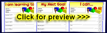 Editable target sheets (for Microsoft Word) with the text ‘I am learning to...’, ‘My next goal is...’ and ‘I can...’. Each sheet has space for 10 targets.