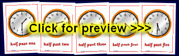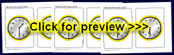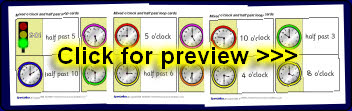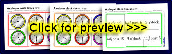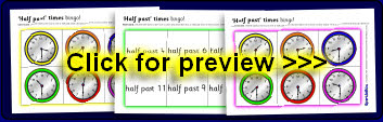 A printable bingo set which includes clock boards as well as ‘half past’ time boards. Laminate the boards for extra durability. A simple but fun activity where children match the ‘half past’ times to the clocks on their board, or visa versa. Ideal for helping children understand analogue clocks.
