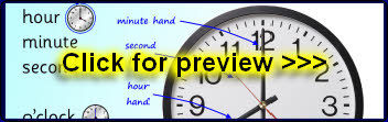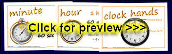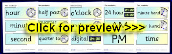 A printable desktop mat with vocabulary and accompanying images related to time.