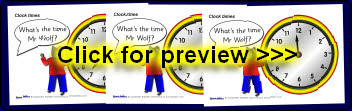 A set of 24 clocks showing featuring ‘Mr Wolf’ and the question ‘What’s the time Mr Wolf?’. Includes ‘quarter-to’ and ‘quarter-past’ times on brightly coloured A4-size analogue clocks. Great as visual aids or for use when playing ‘What’s the time Mr Wolf?’ game outside.