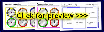 A printable bingo set which includes clock boards and written time boards. Laminate the boards for extra durability. A simple but fun activity where children match the analogue clock time to the times on their board and vice versa.
