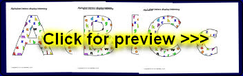 A PDF document with 26 letters of the alphabet (upper and lowercase) filled with coloured alphabet letters. These are great for printing and cutting out for use on displays.
