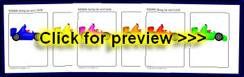 A set of Microsoft Word templates that enable you to add your own words to flash cards featuring coloured racing car images.