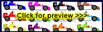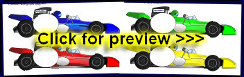 Microsoft Word templates that enable you to add text to coloured racing cars.