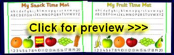 Printable placemats for snack/fruit time featuring the alphabet in lower and upper case, numbers from 1 to 20 and space for the child’s name.