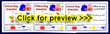 Posters for parents to use at home as prompts when encouraging children to pack their own school bags.