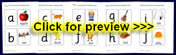 A set printable cards with alphabet sounds a-z and accompanying pictures cards for sound and picture matching games.