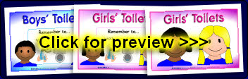 Two colour A4-size signs to remind children to flush the toilet and wash their hands.