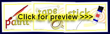 A useful and colourful group of signs for use in your modelling area. Labels include ‘stick’,’glue’, ‘tape’, ‘junk’ and ‘paint’, each with relevant artwork and clear text. Brilliant to enhance and reinforce vocabulary when modelling.