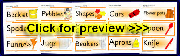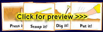 A useful group of signs for use in your classroom sand area. The set includes words such as ‘pour’, ‘full’, ‘empty’, ‘sieve’, and ‘build’, all with accompanying pictures.