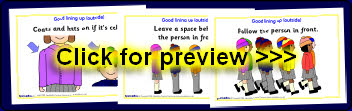 A set of 7 A4-sized posters showing rules for good lining up when going outside.