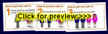 Printable A4-sized posters showing pupils how to put their coats on in 3 simple steps.