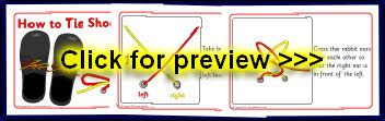 A set of instructions visual aids showing how to tie shoe laces. Ideal for teaching about writing instructions.