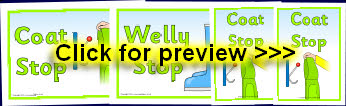Simple printable signs for your cloakroom area showing where children should put their coats and boots.