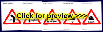 A set of printable road signs with directional vocabulary.