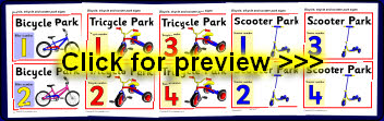 A set of signs for your outdoor area. Add numbers to your bikes/trikes/scooters and create a ‘vehicle park’ where children can park their bike/trike/scooter by the appropriate numbered sign.