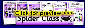 A useful set of signs and labels for your classroom featuring a spider theme. Includes a class banner, signs for different learning areas, resource labels, editable book labels, and other editable templates.