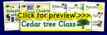 A useful set of signs and labels for your classroom featuring a cedar tree theme. Includes a class banner, signs for different learning areas, resource labels, editable book labels, and other editable templates.