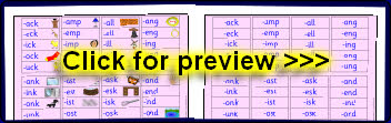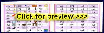 Printable desktop mats showing various rime chunks with and without pictures. Using blue text with a coloured background to assist dyslexic pupils.