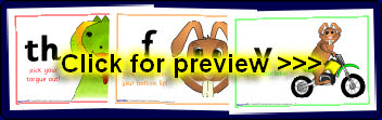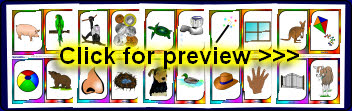 A useful set of brightly-coloured printable picture cards (4-to-a-page) for use with children to help and assess children with language and speech difficulties. Hold up a picture card and ask the child to say what they see. There are two pictures for each of the key speech sounds: p, b, m, n, t, d, w, h, k, g, f, s, l, y, ch, sh, v, z, j, th and r.