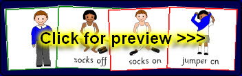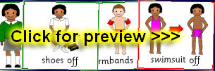 A set of cards to show the steps of getting changed into and out of swimming clothes. Includes both boy and girl cards. Green cards show steps for getting into swimming clothes, and red cards show steps for getting changed back. Ideal for use with children who have difficulty changing independently.