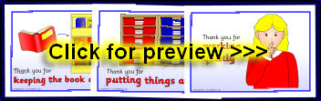 A set of printable posters with the text ‘Thank you for...’ with prompts for keeping various classroom areas tidy and working sensibly.