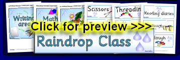 A fantastic set of signs and labels for your classroom featuring a raindrop theme. Includes a class banner, signs for different learning areas, resource labels, editable book labels, and other editable templates.