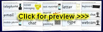 A set of printable word and picture cards featuring types of communication, modern and old.