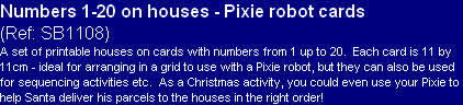 Multi-use printable cards with numbers 0-20 and pictures. Each card is 11cmx11cm for use with a Pixie robot - but they can be printed and laminated for all sorts of other card-based activities.
