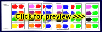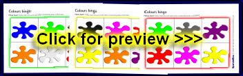 Printable bingo boards with coloured splats and accompanying colour-word cards.