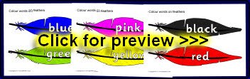 Colour words presented on different coloured feathers.