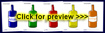 Different coloured bottles on A4 sheets with corresponding word labels.