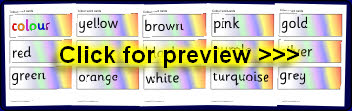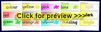 A set of word cards with terms associated with colour. Includes all the common colour names plus less common colours along with other words associated with colour.