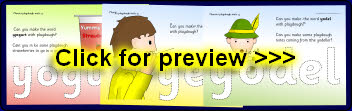A set of simple printable mats where children make words with ‘y’ and related objects from playdough.
