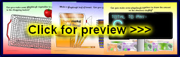 A set of playdough mats with a supermarket food theme. Children make fruit and vegetables for the basket, crisps, eggs for the egg box and numbers on the till display.