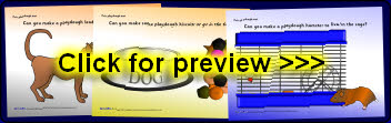A set of 6 printable tabletop mats where children are encouraged to make various pet-related items from playdough.