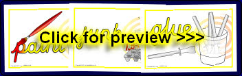 A useful and colourful group of signs for use in your modelling area. Labels include ‘stick’,’glue’, ‘tape’, ‘junk’ and ‘paint’, each with relevant artwork and clear text. Brilliant to enhance and reinforce vocabulary when modelling.