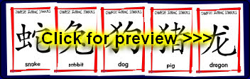 Set of printable posters featuring the Chinese symbols representing each of the Zodiac animals.