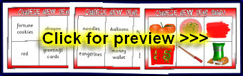 A set of printable bingo word and picture boards with items linked to the Chinese New Year festival.