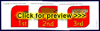 A set of printable visual aids featuring the 12 different animals of the Chinese Zodiac. Includes the ordinal numbers from 1st through to 12th.