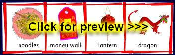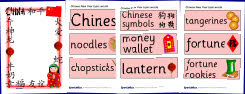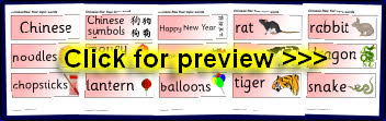 Set of printable word cards with accompanying pictures, linked to a topic on Chinese New Year. Includes the 12 animals of the Chinese Zodiac as well as some Chinese symbols and other useful words.