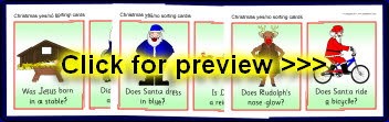 A set of printable cards posing questions about Christmas that can be answered ‘yes’ or ‘no’. Includes questions such as, ‘Does Santa dress in blue?’, ‘Does he ride a bicycle?’, ‘Was Jesus born in a stable?’
