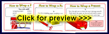 A set of instructions visual aids showing how to wrap a present. Great for linking with birthdays or Christmas and for teaching about instructions.
