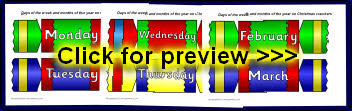 Days of the week and months of the year presented on colourful Christmas crackers.