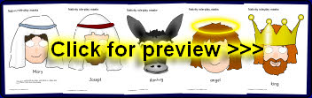 Simple printable masks for use in role-play or for retelling the Nativity story. Simply cut out the eyes and attach a lollipop stick as a handle.