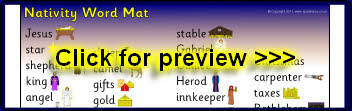 A printable word mat featuring words and pictures from the Christian Nativity story. Ideal for children to use as prompts when writing.