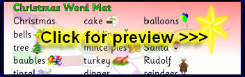 A printable word mat featuring words and pictures linked to Christmas. Ideal for children to use as prompts when writing. See also our Nativity word mat.