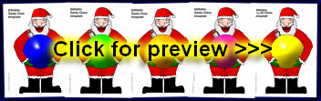 Microsoft Word templates that enable you to add your own text to cartoon Santas holding giant coloured Christmas tree baubles.