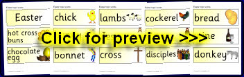 A set of printable word cards with pictures linked to Easter. It includes both religious and non-religious words. These are perfect for use in a topic word bank, or for using in classroom displays linked to Easter.