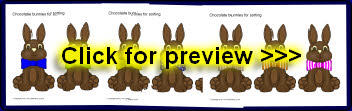 A set of chocolate Easter bunnies of different sizes with various patterned and coloured bow ties. Ideal for sorting activities.